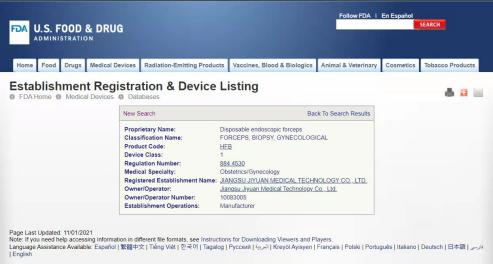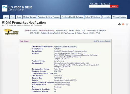 1、一次性電子宮腔鏡及醫(yī)用圖像處理系統(tǒng)獲得美國FDA注冊